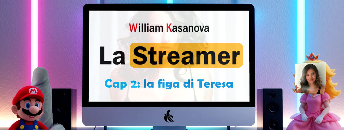 Attraverso la porta e resto basita: le pareti della camera da letto sono attraversate da strisce di led, un pannello luminoso simile ai neon dei bar dei vecchi film americani mostra il logo di Twitch e il nome “PrincessBitch” con una coroncina sopra la “B”. Sui mobili bianchi ci sono ovunque peluche di Super Mario e dei suoi amici, e c’è una Principessa Peach sul cui volto è attaccata una foto della troia – ho capito adesso la battuta con il nickname… imbarazzante… – e decine di statuine di personaggi di qualche altro videogioco. Il copriletto mostra un coso rosa rotondo vestito da guerriero verde, un treppiede accanto sorregge una videocamera puntata sul letto, una webcam ed un microfono professionale sono accoppiati ad un computer con doppio schermo curvo. Accanto c’è un’altra dannata console come quella del mio ragazzo.